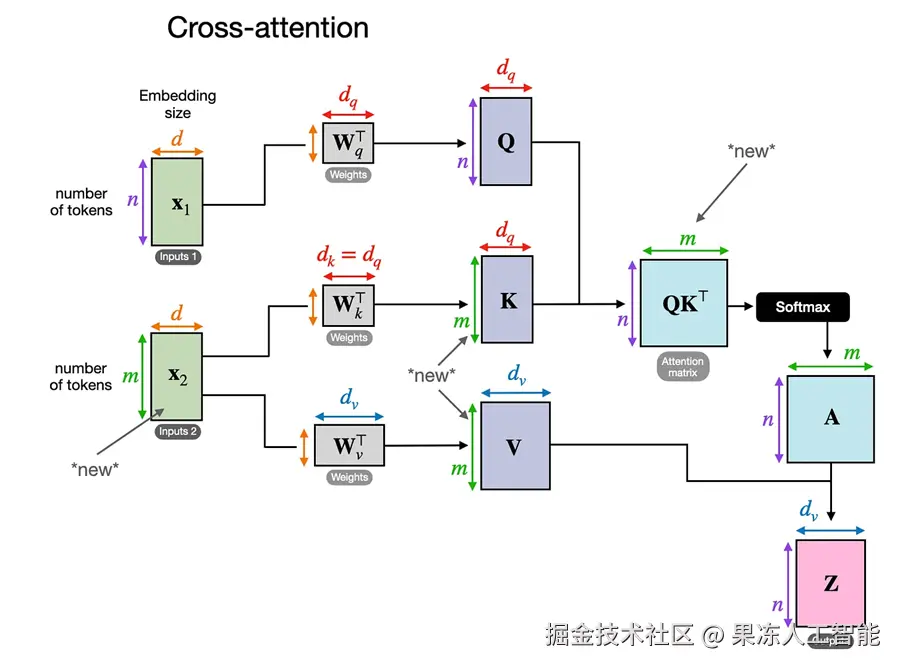 在跨注意力(cross-attention)里,不同于自注意力只有一个输入序列,我们会有两个不同的输入源,如下图示意。