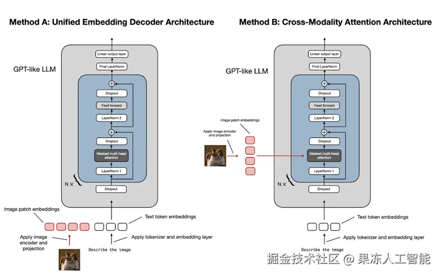 在上面的跨模态注意力架构中,我们依然使用之前讨论过的图像编码器设置。但与把图像的patch嵌入作为LLM输入不同,这里是在多头注意力层中通过跨注意力机制把图像信息接入进来。