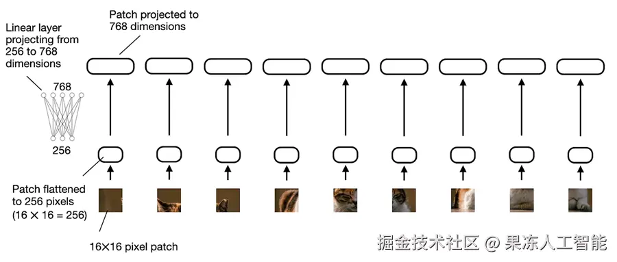 图示:线性投影层把展平的图像 patch 从 256 维投影到 768 维嵌入空间。