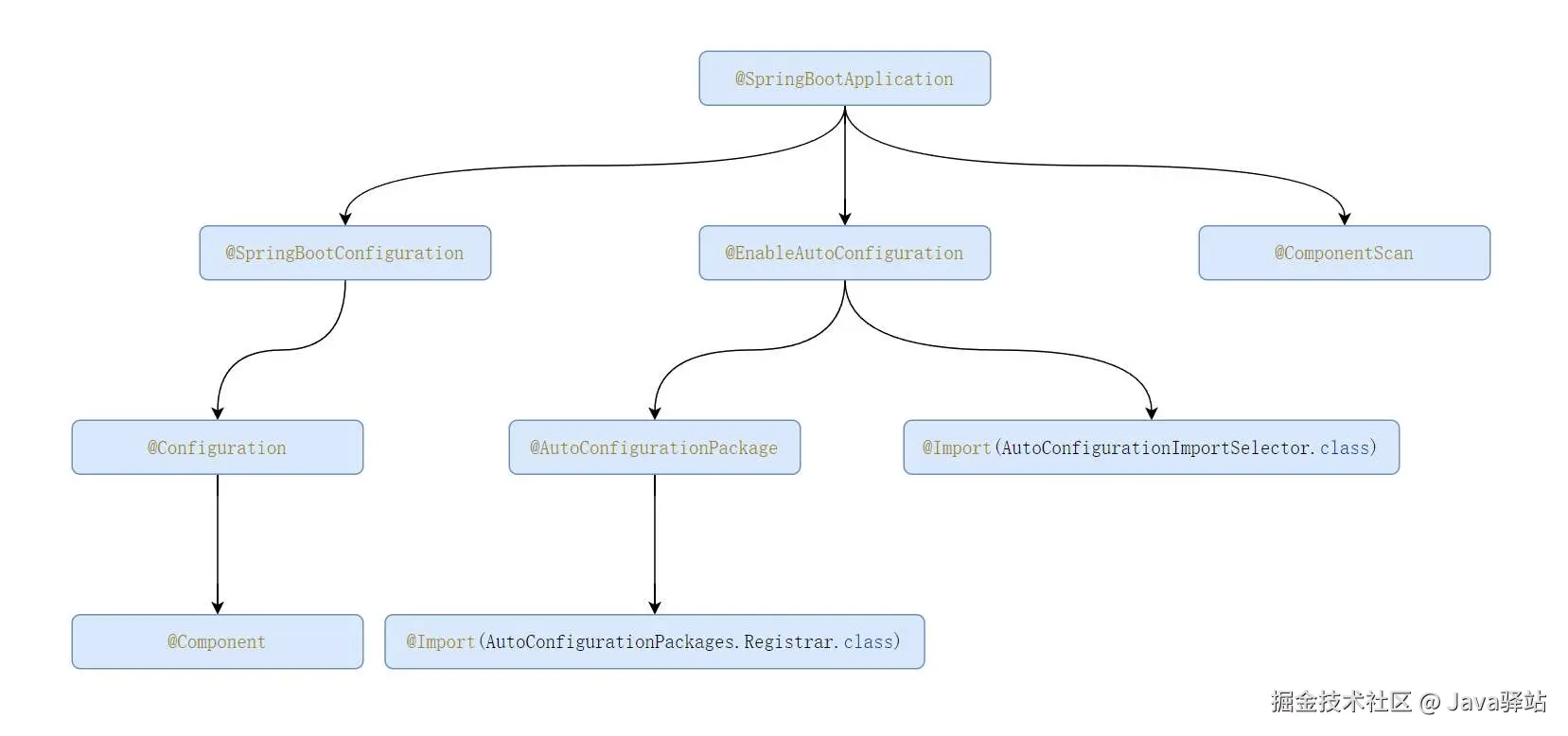 @SpringBootConfiguration 注解是在 Spring Boot 中对 Spring 标准 @Configuration 注解的替代方案,这个注解本质上就是 @Configuration 注解,从上述注解关系图中我们可以看出,@Configuration 其实又是 @Component 注解,这意味着被这个注解标记的类其实就是一个 Spring 配置类(configurationClass)。