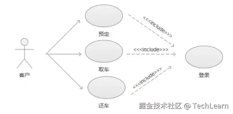 再举个例子:仍然是汽车租赁系统,客户无论是预定、取车还是还车,都需要用户登录,所有此时使用例“登录”被用例“预定”、“取车”和“还车”所包含,这样就能避免许多重复的动作。