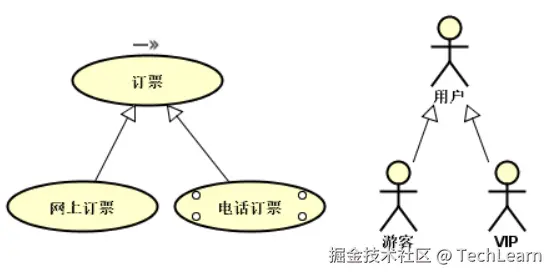 例如电话订票用例和网上订票用例指向订票用例,游客和vip指向用户用例。