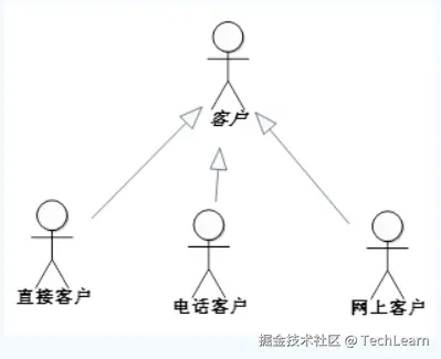 假设汽车租赁系统可以接受客户的电话预定和网上预订,那么参与者“客户”就描述了参与者“电话客户”和“网上用户”所扮演的一般角色。泛化关系与类图一样都使用一个空心三角箭头表示,指向扮演一般角色的超类。