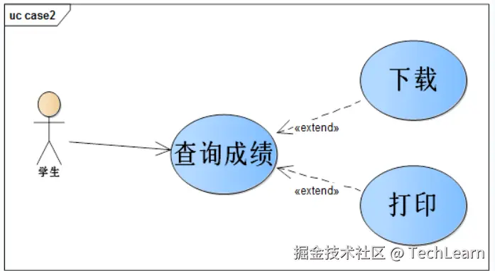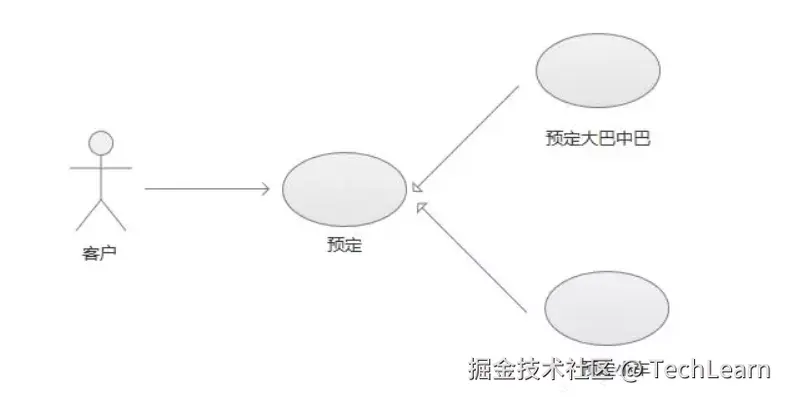 扩展关系:使用虚线箭头表示,箭头指向基用例。