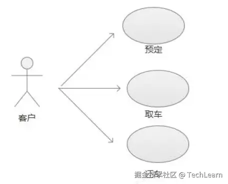 这是最常使用的关系,用带箭头的实线来描述。以汽车租赁系统中的“客户”参与这以及和他交互的3个用例(预定、取车和换车)为例。