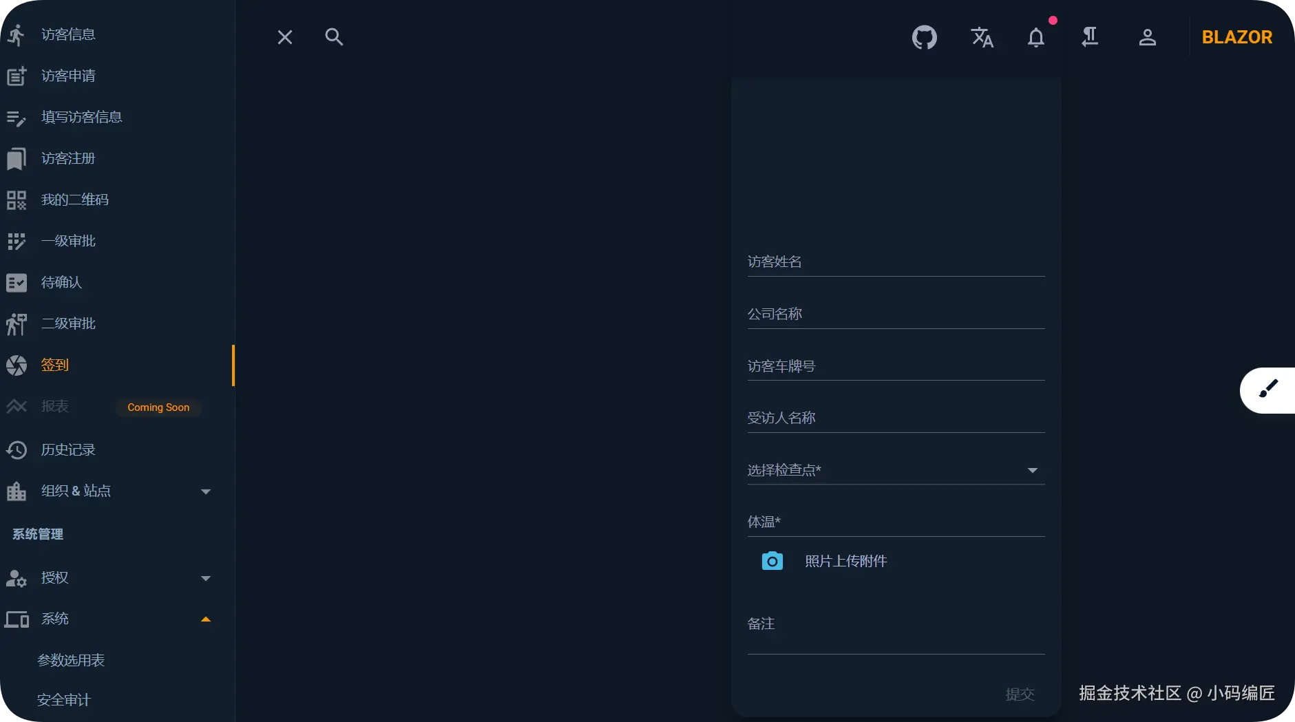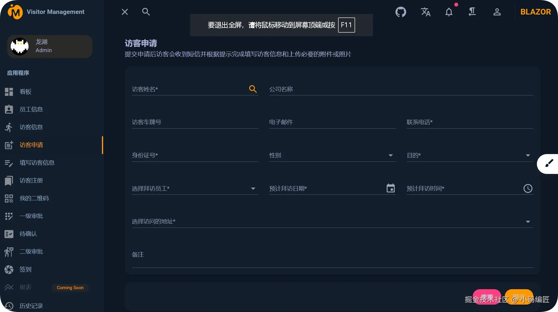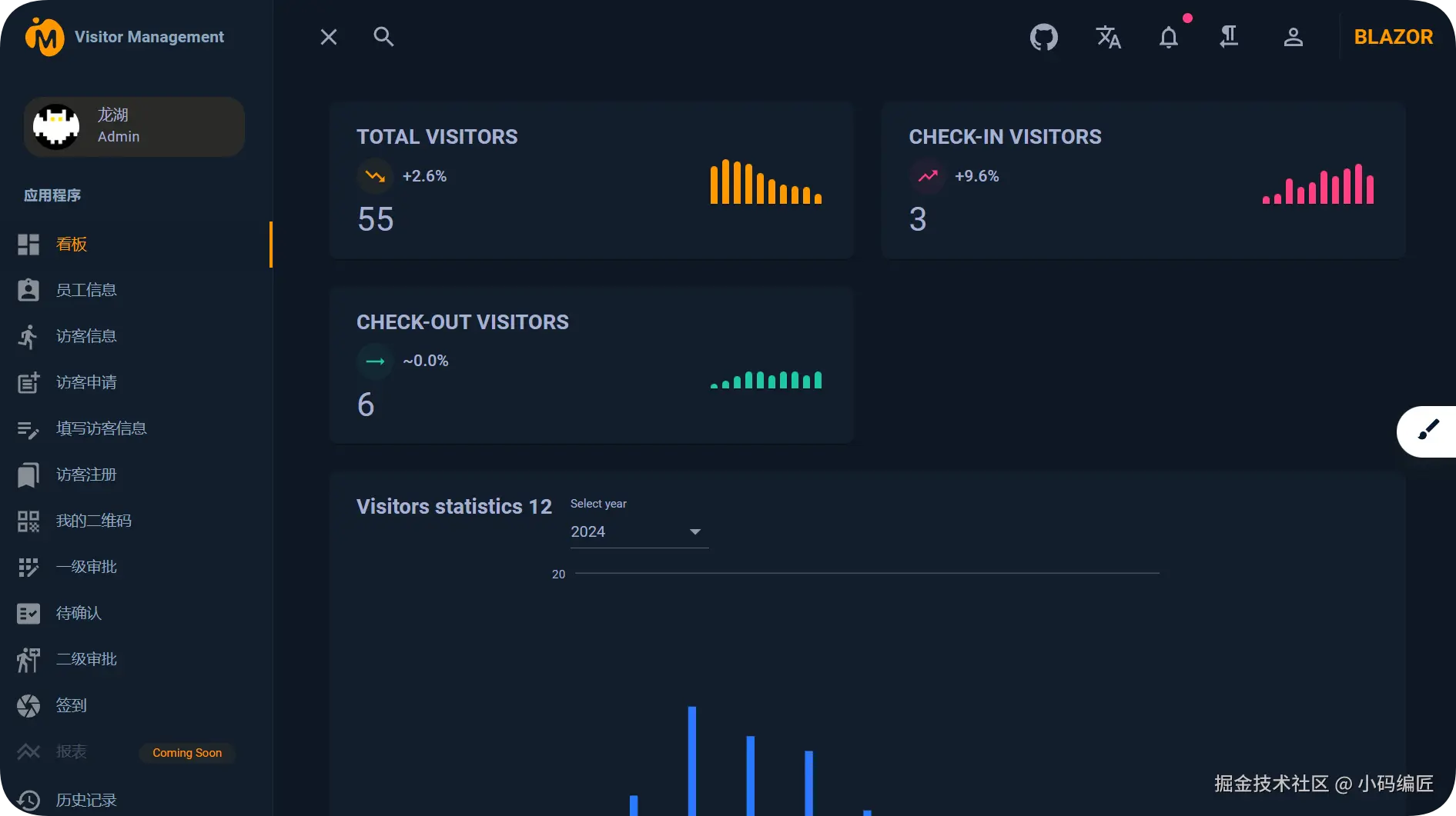 基于 .NET 和 Blazor 开发的智能访客管理系统,可以简化和优化访客管理流程,提升安全性和效率。它以数字化方式取代了传统的纸质登记,实现了访客信息的快速、准确录入与实时追踪。