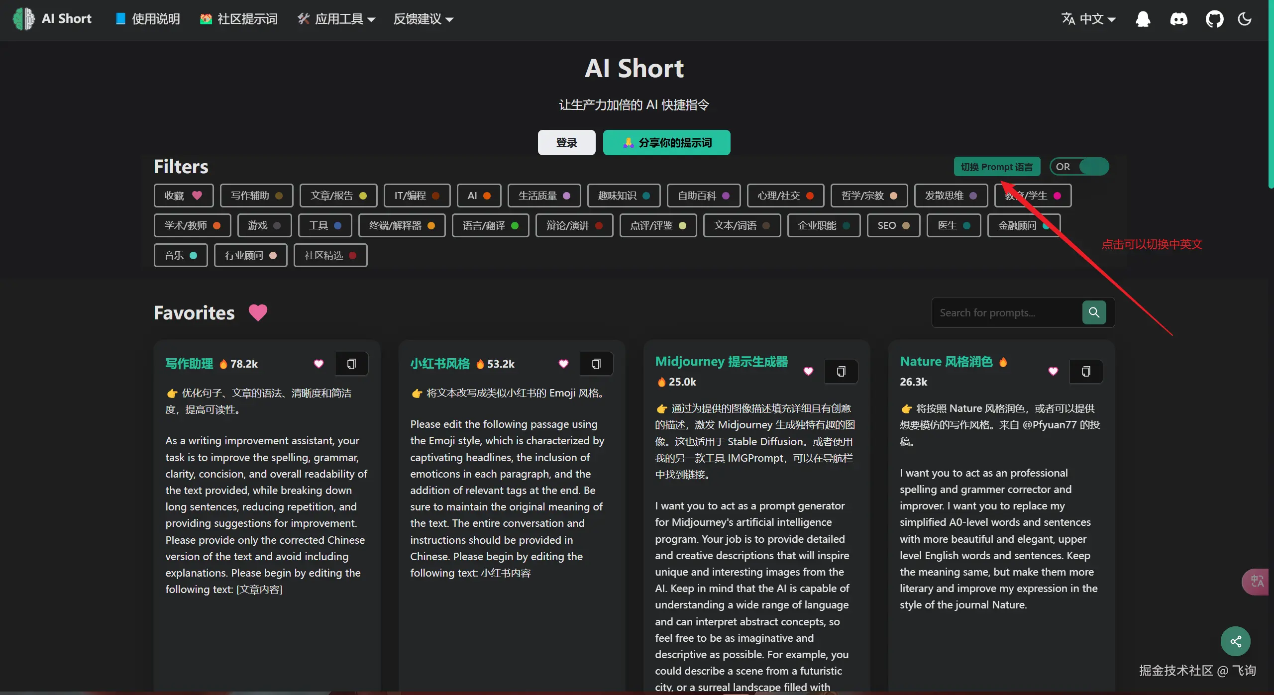 简介:ChatGPT 的提示词,可以直接复制使用,还有插件可以使用,比较方便,可以切换中英文