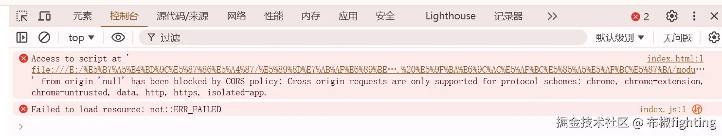 因为浏览器的 CORS(跨域资源共享) 策略限制了从 file:// 协议加载脚本。浏览器不允许直接从本地文件系统(如 file://)加载模块化的 JavaScript 文件, 只允许通过 http://、https:// 等协议来加载脚本资源,所以运行 index.html 时收到了 CORS 错误