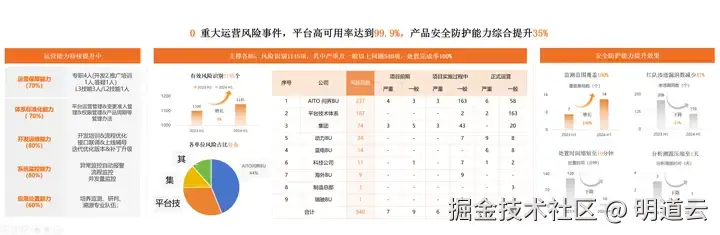 - 运营管理:目前有 4 人团队负责明道云平台,2 人专门答疑,运维保障理念目前为 70%,未来可能需增加人手。建立平台运营标准体系,包括开发运维、系统监控、应急处置能力。建立知识库,分析运营中明道云的问题,是操作问题还是平台 bug,识别风险问题。安全能力从去年到今年有较大提升,包括监测范围、渗透测试等全面升级。