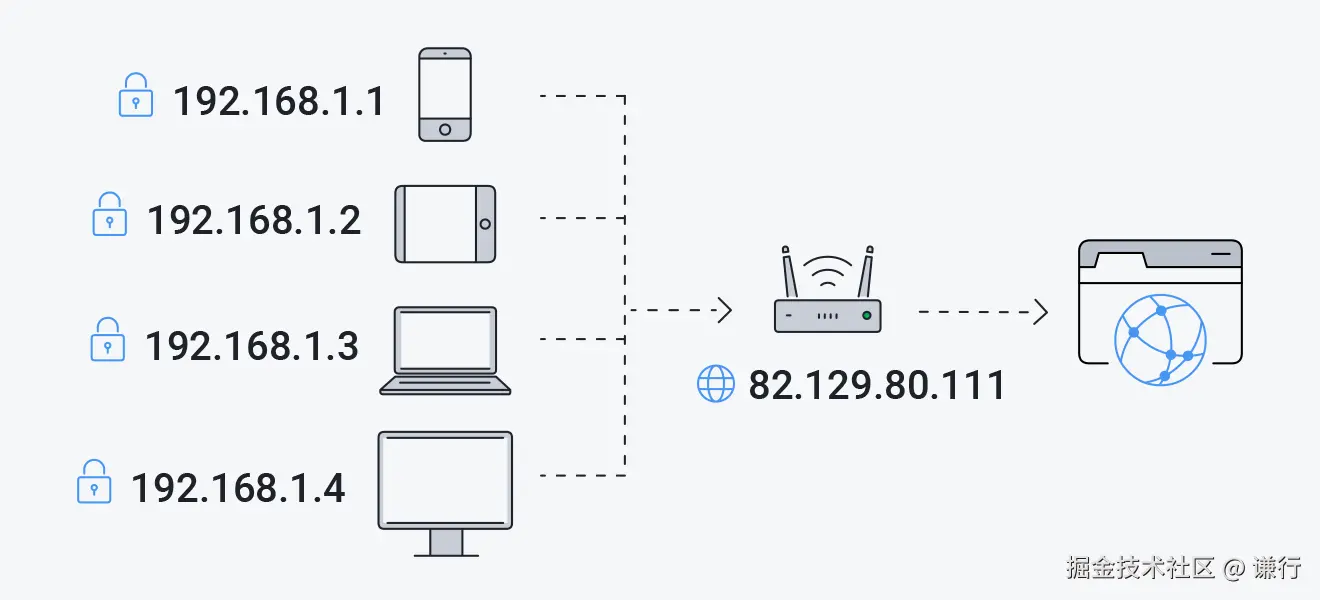 - 路由器拥有一个公网IP地址(由ISP分配,如 82.129.80.111),所有内部设备的互联网流量通过路由器的 NAT 转换为这个公网 IP 地址