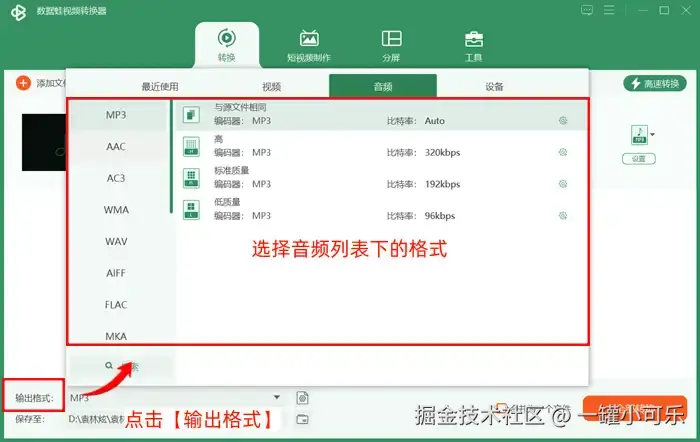 步骤2:在主页的左下角点击【输出格式】,打开音视频格式列表,选择音频列表下的格式。