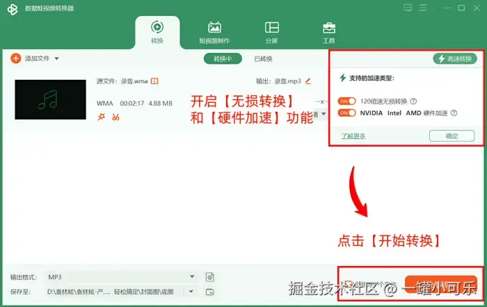 步骤3:返回主页面,点击【高速转换】,开启【无损转换】和【硬件加速】功能,然后点击【开始转换】。
