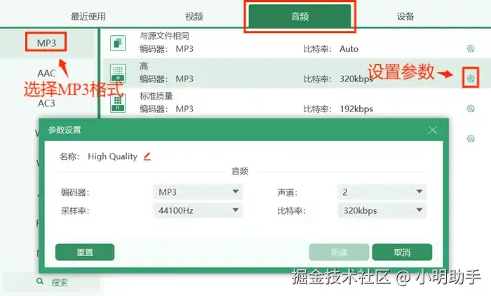 第三步: 在进入输出格式选择界面后,点击界面上方的【音频】按钮,选择MP3格式。还可以点击右侧小齿轮按钮设置比特率、采样率等参数。