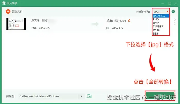 步骤3:在图片格式转换界面,点击右上角处的格式选择选项,下拉选择【jpg】格式,然后点击下方的【全部转换】即可。