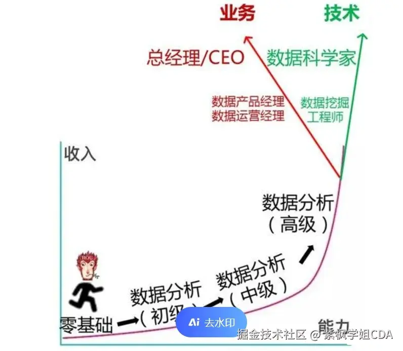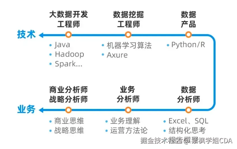数据分析师的发展路径统共来说可以分为偏业务和偏技术两个方面的发展路径: