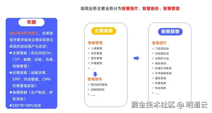 依据国务院 79 号文,2027 年企事业单位要进行国产化替代,但医疗行业目前尚无很好的解决方案,硬件、网络、中间件等技术底层需实现国产化。