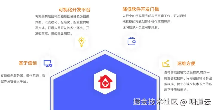 - 底层架构:基于明道云构建底层架构,在此基础上创建业务场景,实现组建设计、代码开发、实时上线。明道云通过了信创认证,基于其创建的系统从底层逻辑看类似配置文件,做信创成本低,无需众多公司参与改造,风险小。