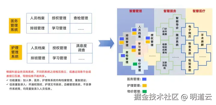 - 信息分散:医院存在大量供应商,部门间协同差,多数信息化系统为部门级应用,信息共享因架构不统一受影响,各公司产品架构和逻辑不同。