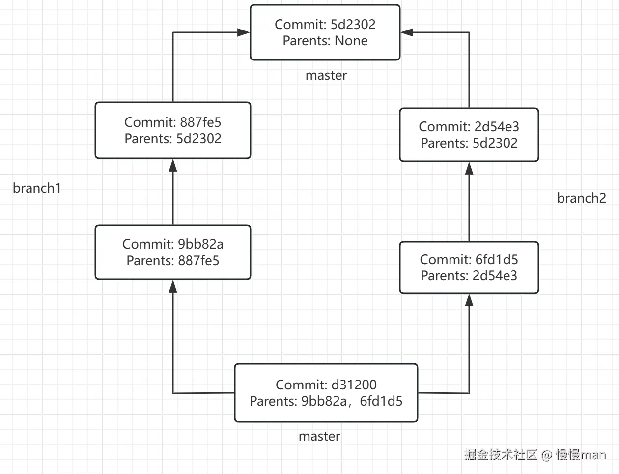 先看一个示例,创建一个git记录如下,从master分支创建两个branch,并分别提交两次,最后又合并到master分支。然后我们在master分支上,通过指令看看每个操作对应的哈希值。