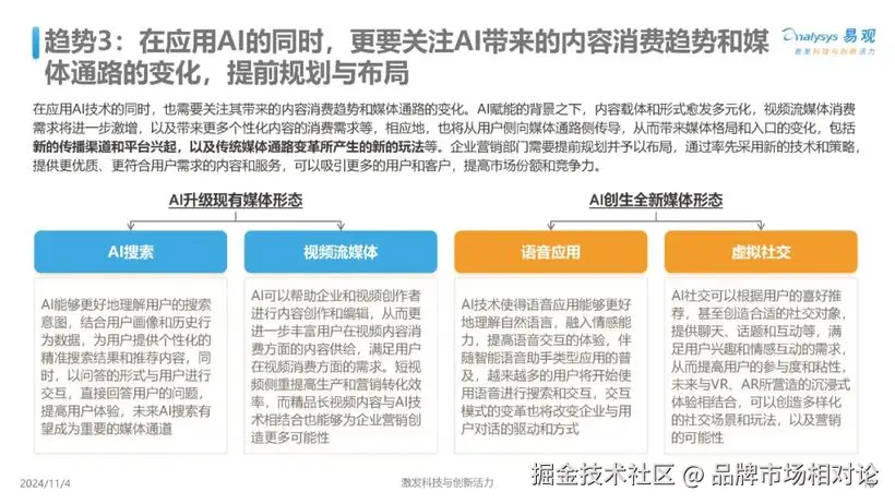 随着AI技术的发展,内容载体和形式愈发多元化,视频流媒体消费需求激增,语音应用更加普及,虚拟社交场景也变得更加丰富。这些变化不仅改变了用户获取信息的方式,也影响了媒体格局和入口的选择。企业营销部门需要提前规划布局,利用新技术和策略提供符合用户需求的优质内容和服务,以此吸引更多的用户和客户,增强市场竞争力。