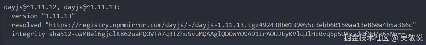 根据这个我们知道,如果我们使用的库都是按照这个规则进行版本管理的时候,我们每次更新只要不动主要版本号就可以了。也是因为如此,我们安装第三方库的时候,默认是这样的:"dayjs": "^1.11.13",而 ^ 就代表下载软件的时候只会下载 1.11.13 <= dayjs < 2.0.0 的版本。同样 yarn 在依赖合并上也是这样做的,假如我们安装了两个版本: