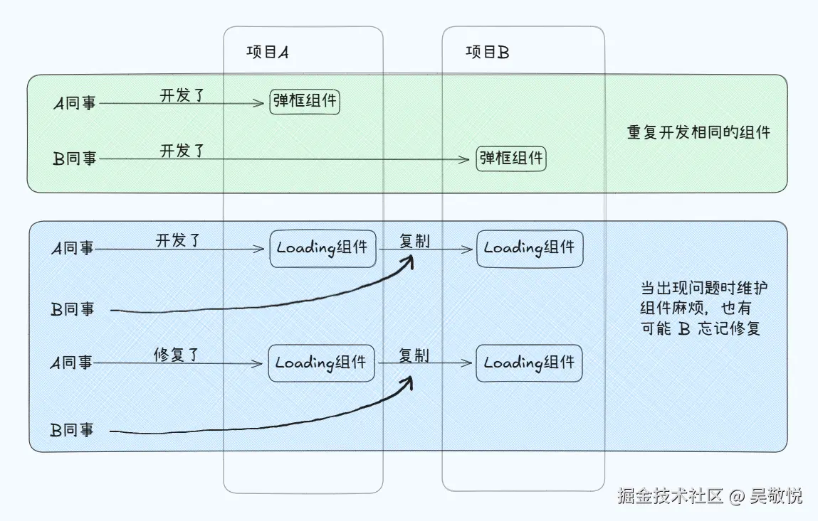 - 相同功能组件重复实现的问题。在前端开发中一个组件在多个项目中重复出现,如果是不同的人负责不同的项目,更容易出现同样相同的组件却需要不同的人实现,耗费多倍的人力,如果通过拷贝的方式实现代码共享,那么发现组件有问题的时候就得需要反复复制。