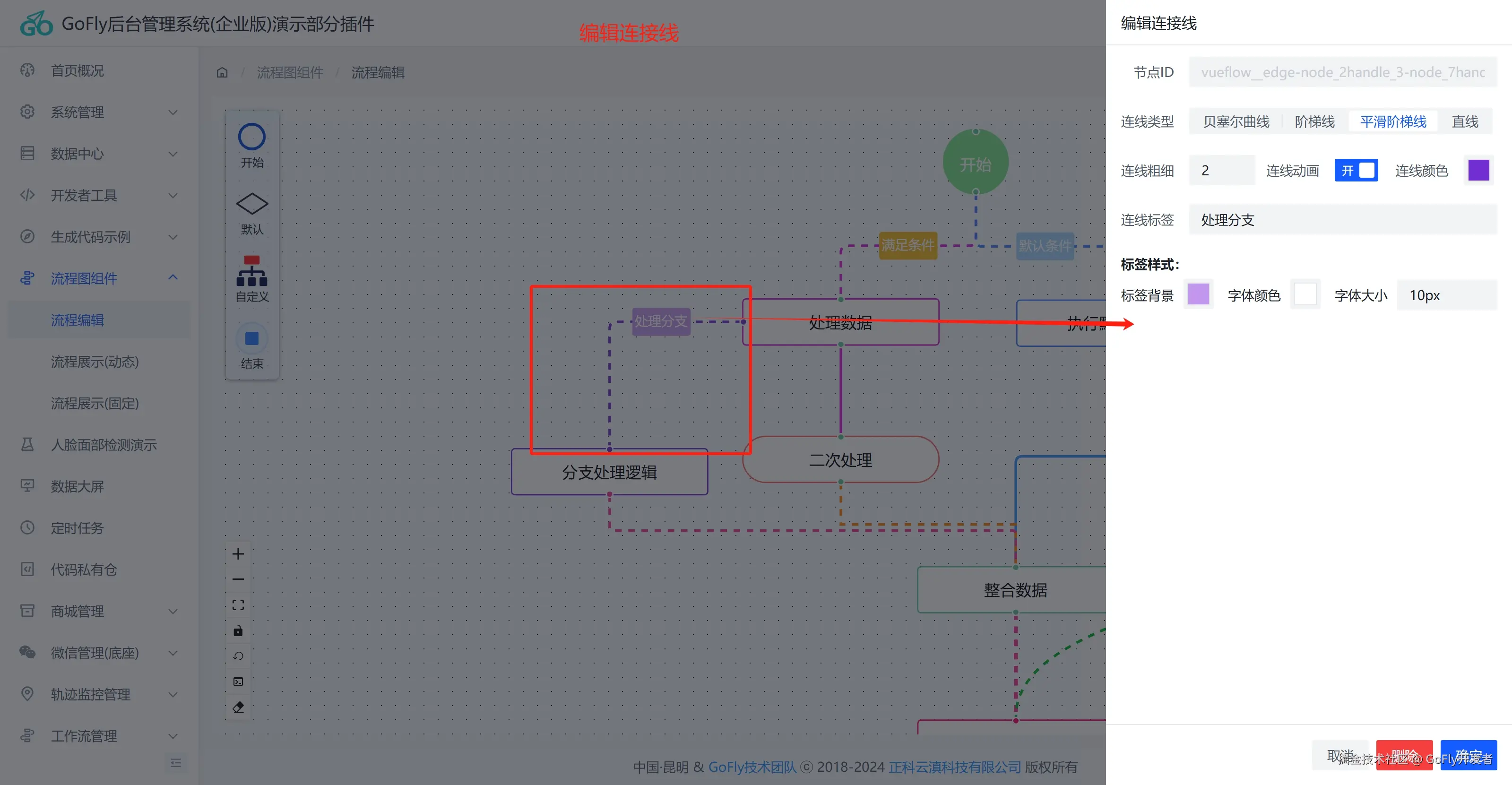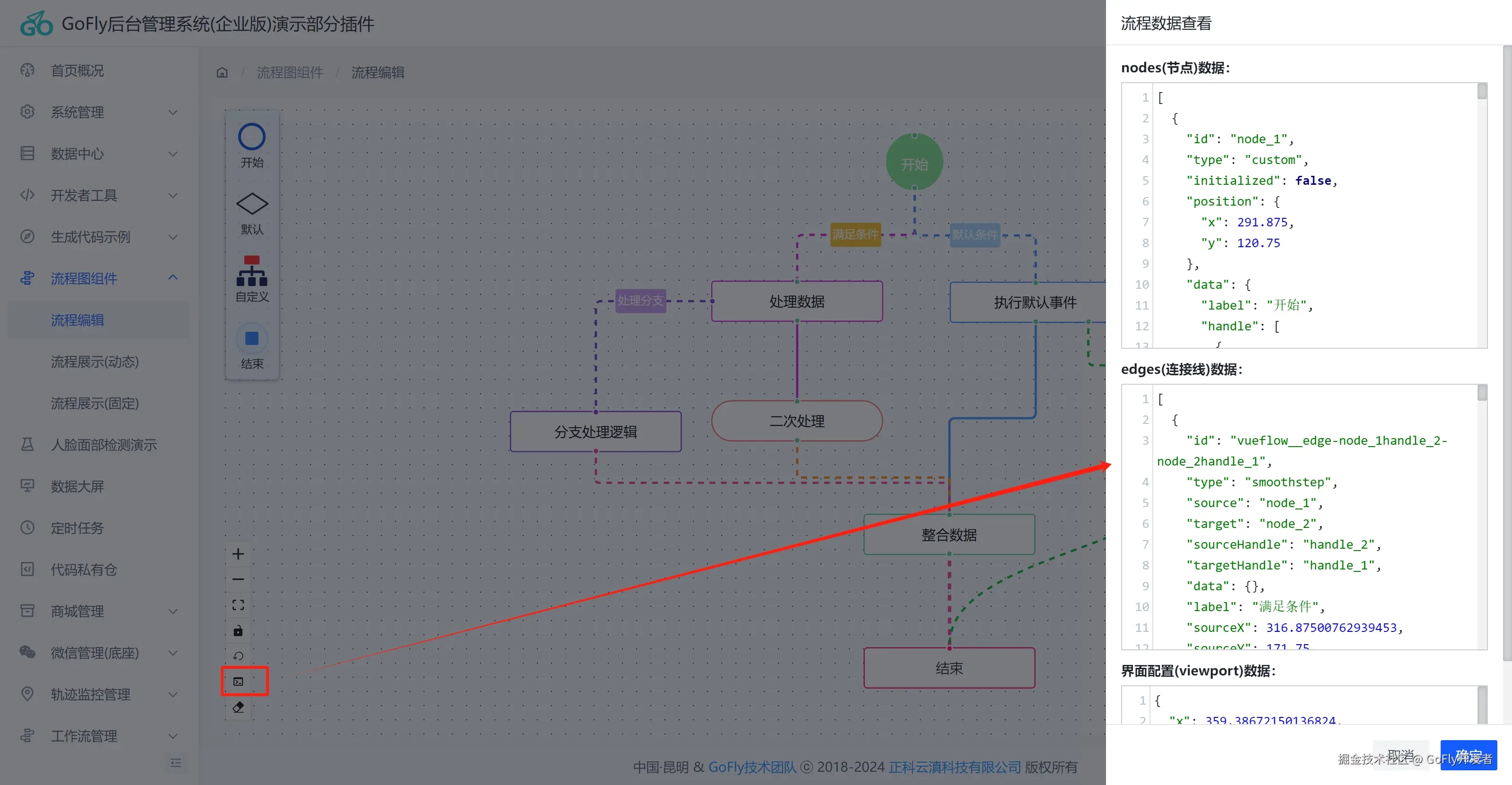 为了方便做出流程数据,我们提供了vue-flow的编辑工具(这是Vueflow没有提供)编辑器基于vue3的Arco Design前端UI框架基础编辑,编辑器可以快速拖出漂亮的流程图、审批流程。编辑编辑器如下图(需要动画体验去上面提供在线体验地址查看):