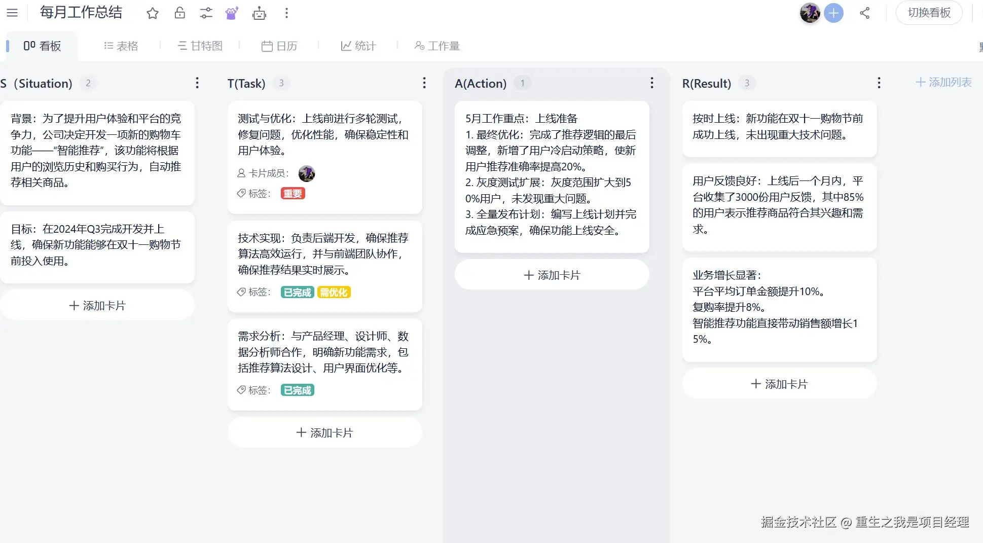 可以用看板类工具(例如板栗.看板)做工作流的整理和安排,这样可以清晰记录自己的工作初心和要点,以及每一步重要动作,汇报或演讲的时候更自如。