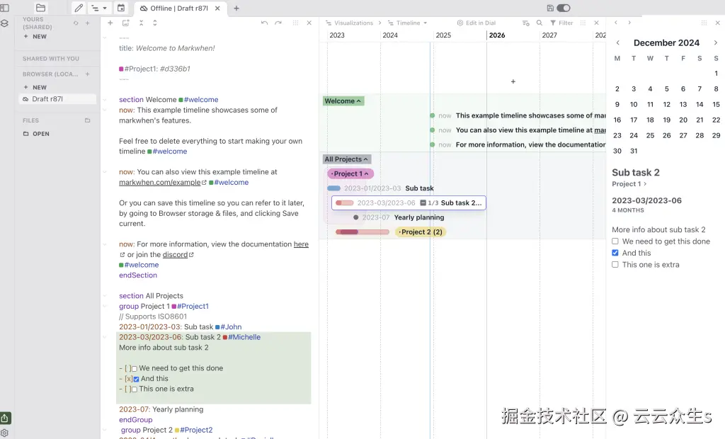因此,我们最终会在现有应用程序中使用这项技术——毕竟,这是它能够在现实世界中运行的最终证明。记住,唯一可移植的数据是 Markwhen 代码;目前,您受到支持它的应用程序数量的限制。幸运的是,Obsidian 就是其中之一。