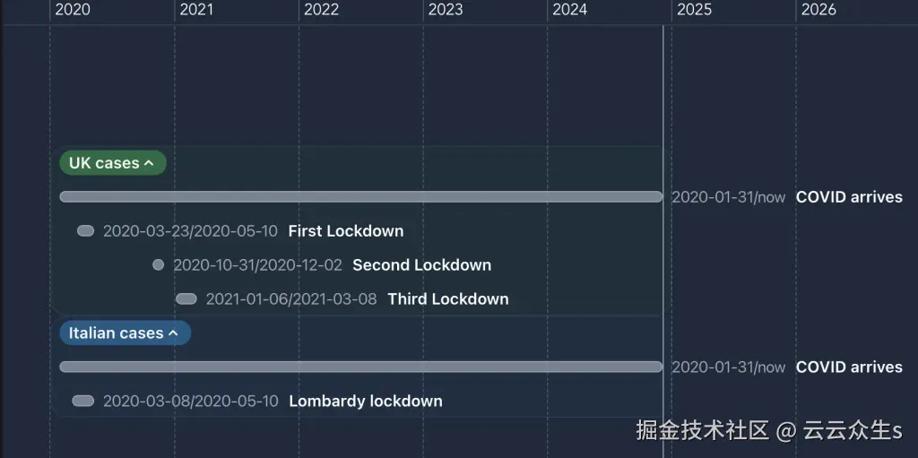 Markwhen处理的是日期范围,但如果我们只提及一个日期,它会查看粒度并将边缘标记为范围。因此,对于“1961”,定义的范围是1961年1月1日至1961年12月31日。