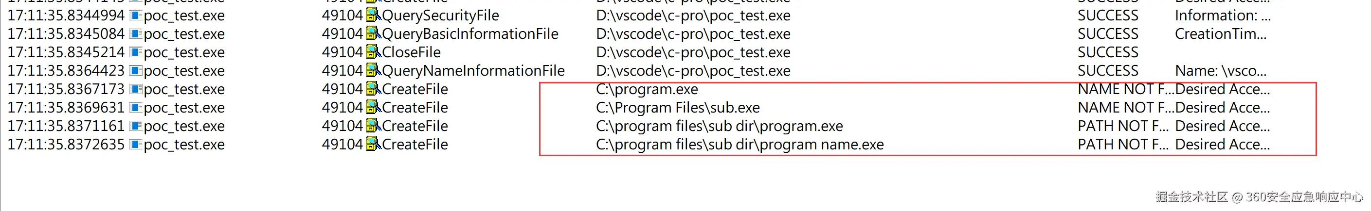 该测试程序尝试通过CreateProcessA启动"c:\program files\sub dir\program name",编译并运行该程序,同时使用Process Monitor监控,可以看到Process Monitor监控到了程序预期的行为。如果c盘根目录存在program.exe,则c:\program.exe将会被执行。