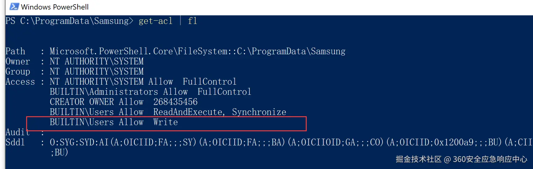 C:\ProgramData目录是弱权限,查看C:\ProgramData\Samsung\ 目录权限,可以看到普通用户可以读写。
