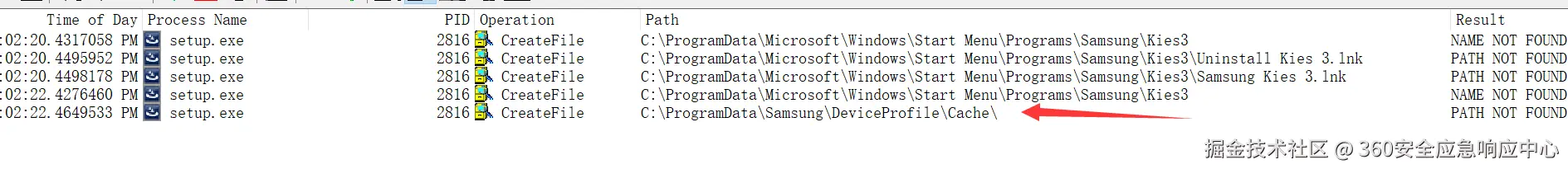 该漏洞是关于Samsung Kies(三星官方提供的可将手机与电脑连接的一款PC套件工具),程序卸载时存在验证不当的情况,导致本地攻击者能够利用目录链接删除任意目录。使用Process Monitor监控该文件卸载过程,发现该程序会尝试删除C:\ProgramData\Samsung\deviceprofile\cache 目录内容,而该目录不存在。