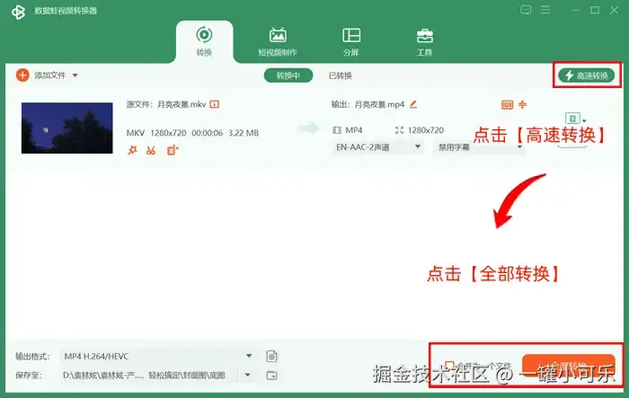 步骤3:点击mkv转mp4选项右侧的【高速转换】,开启【120倍速无损转换】和【AMD硬件加速转换】,最后点击【全部转换】即可。