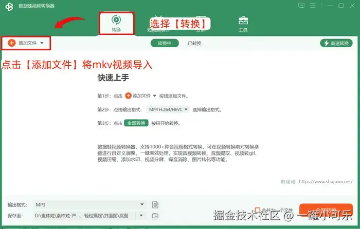 步骤1:运行数据 蛙视频转换器,选择【转换】,点击【添加文件】将mkv视频导入到该转换界面中;或者是直接从本地文件夹中将mkv文件一键拖入。