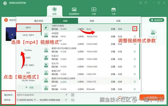 步骤2:点击【输出格式】,选择视频格式界面下的【mp4】视频格式,并点击设置图标,调整视频格式参数。
