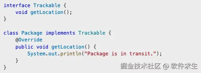 示例: 比如开发一个物流系统,可以定义Trackable接口,所有可以追踪的物品都实现这个接口。