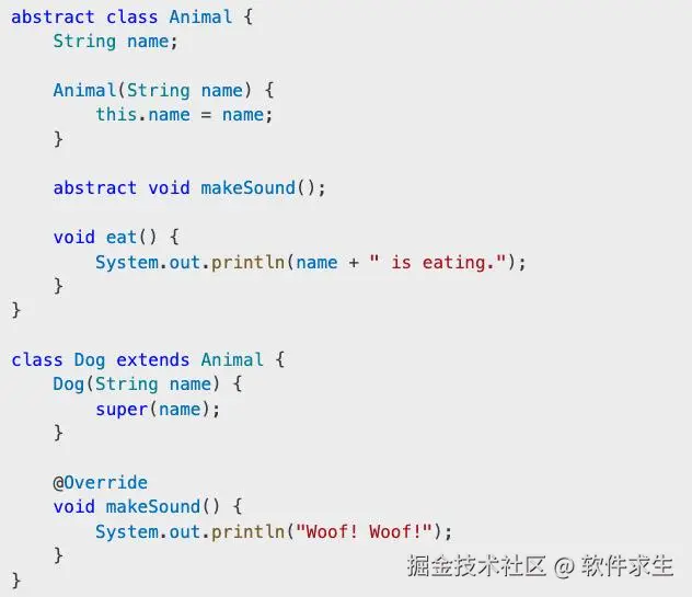 - 抽象类:用于描述一类事物的共性,比如动物有名字、有吃饭的行为,但具体的叫声需要各个子类自己实现。