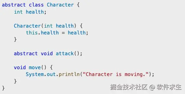 示例: 比如开发一个游戏,定义了一个Character抽象类,所有的游戏角色都需要继承它。