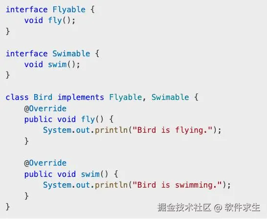 - 接口:用于描述一组功能的契约,比如飞行、游泳等行为,可以被不同的类实现。