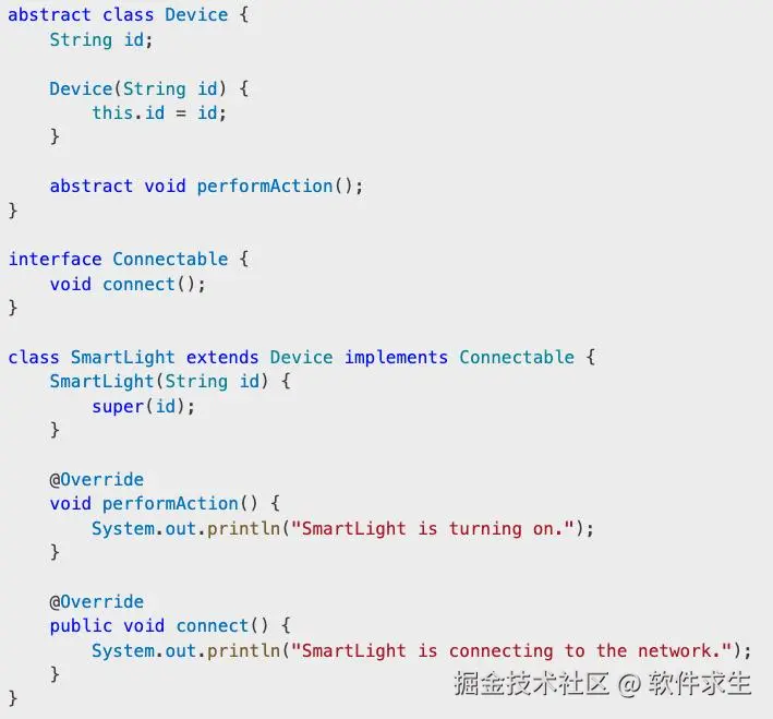 示例: 开发一个IoT系统,Device是一个抽象类,Connectable是一个接口。