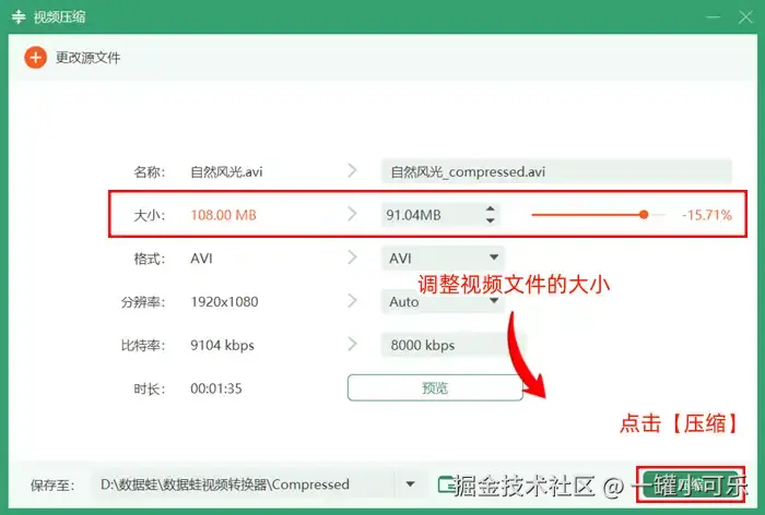 步骤3:调整视频文件的大小(可直接输出精准的体积数值或拖动调节条),然后点击【压缩】即可。