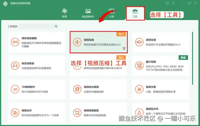 步骤1:双击应用图标,打开数据 蛙视频转换器,选择【工具】板块下的【视频压缩】工具。