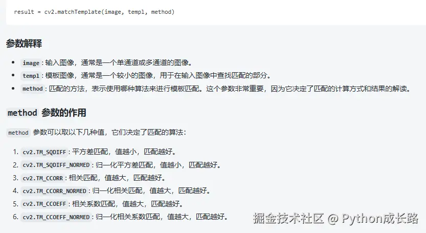 核心函数就是cv2.matchTemplate,它是用来做模版匹配的,通俗点说是在一个图中找出另一张图,看一下gpt的参数解释:
