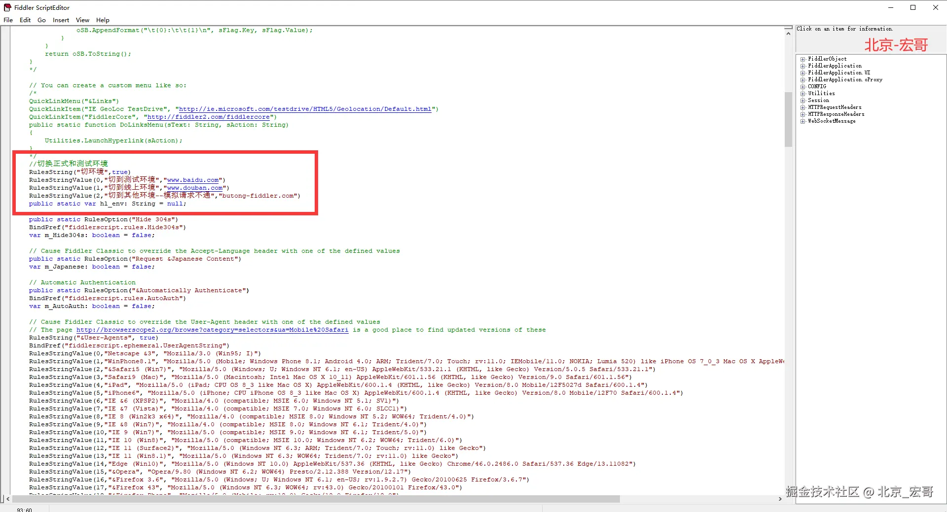 2.在Fiddler Script中的FiddlerObject顶部定义不同环境的object,如下图所示: