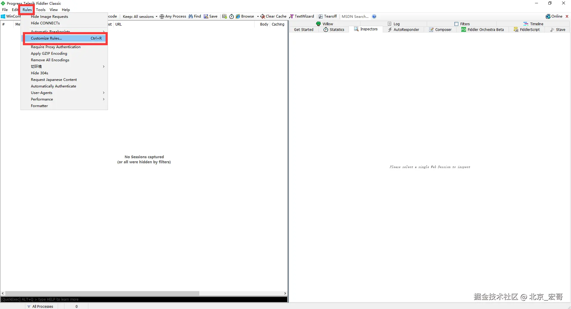 1.启动Fiddler,点击Rules-->Customize Rules... ,如下图所示: