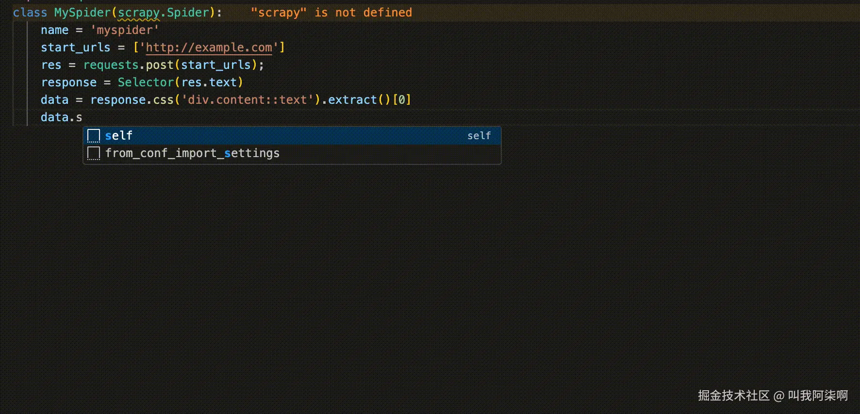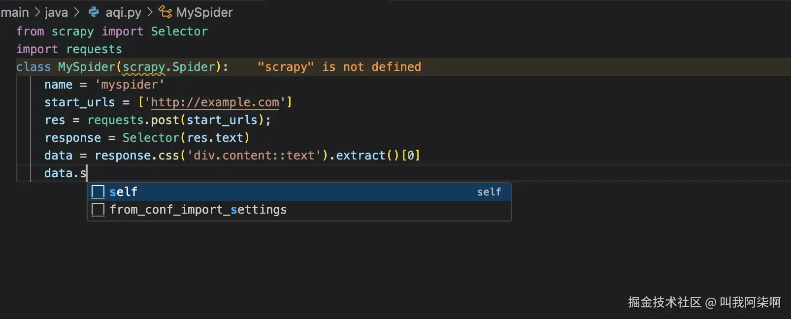 而在python中,简单的变量定义还可以识别类型。但在经过一系列的方法调用之后,IDE就无法识别变量类型。如下图所示,data最后被解析出来之后应该是一个字符串,但是IDE不会识别类型,所以也没有进行对应的方法提示。