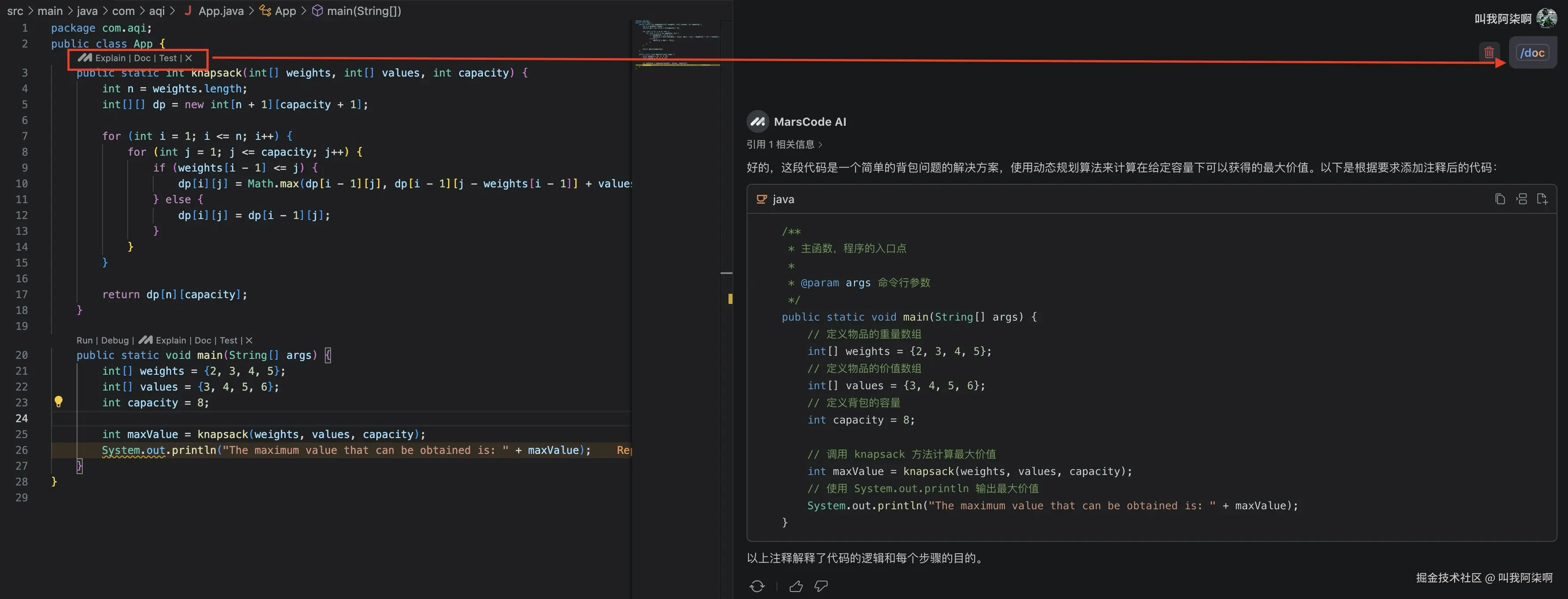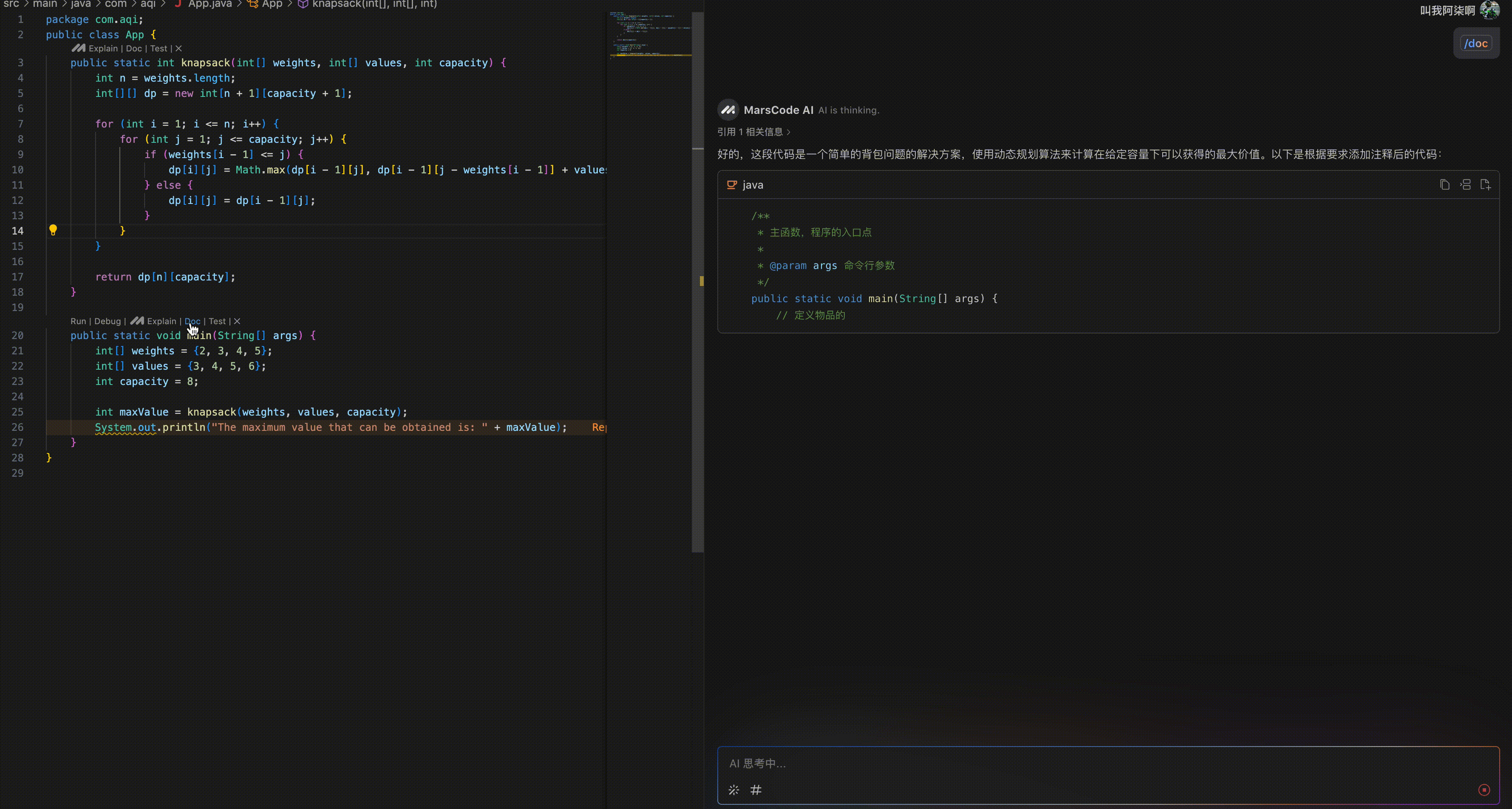 可以通过marscode的 /doc 指令,为我们的代码生成注释。