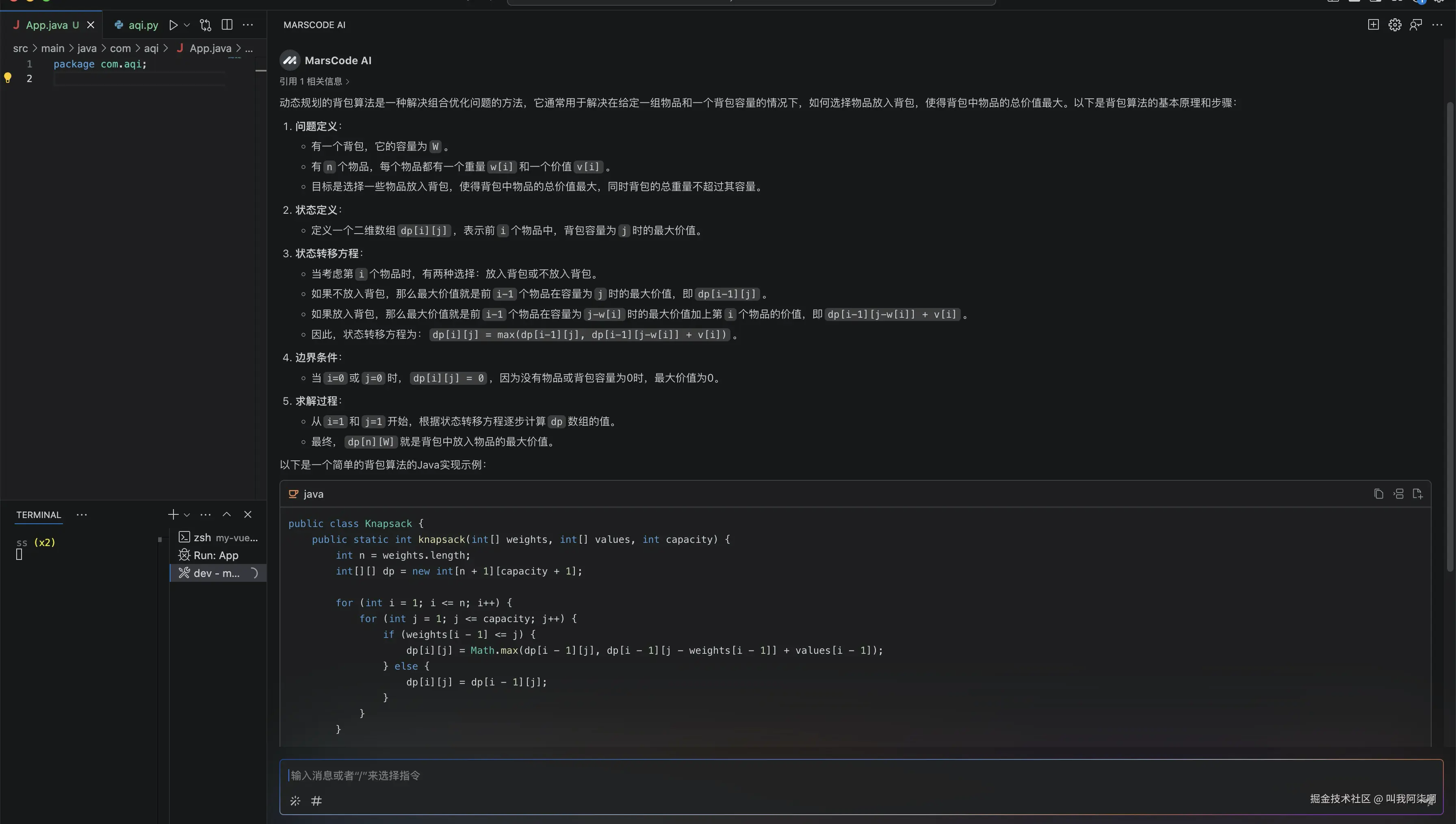 还记得当年在大学参加蓝桥杯的时候,因为初学算法,被动态规划的背包算法困住了好久,在百度上查找了很多代码。如今有了marscode,他不仅能给我生成想要的代码。