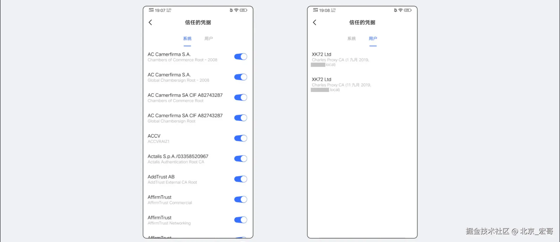 我们自己安装的 Charles 证书都属于用户 CA 证书。除了证书的权限问题,Android 的不同版本对权限的处理规则也不一样: